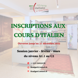 L’Istituto Italiano di Cultura di Algeri è lieto di annunciare l’apertura delle iscrizioni ai corsi di lingua italiana per la sessione gennaio–marzo 2026, articolati su tutti i livelli e disponibili in formule di gruppo, lezioni individuali e modalità online.
